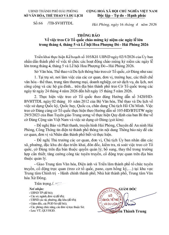 Thông báo về việc treo Cờ Tổ quốc chào mừng kỷ niệm các ngày lễ lớn trong tháng 4, tháng 5 và Lễ hội Hoa Phượng Đỏ - Hải Phòng 2026
