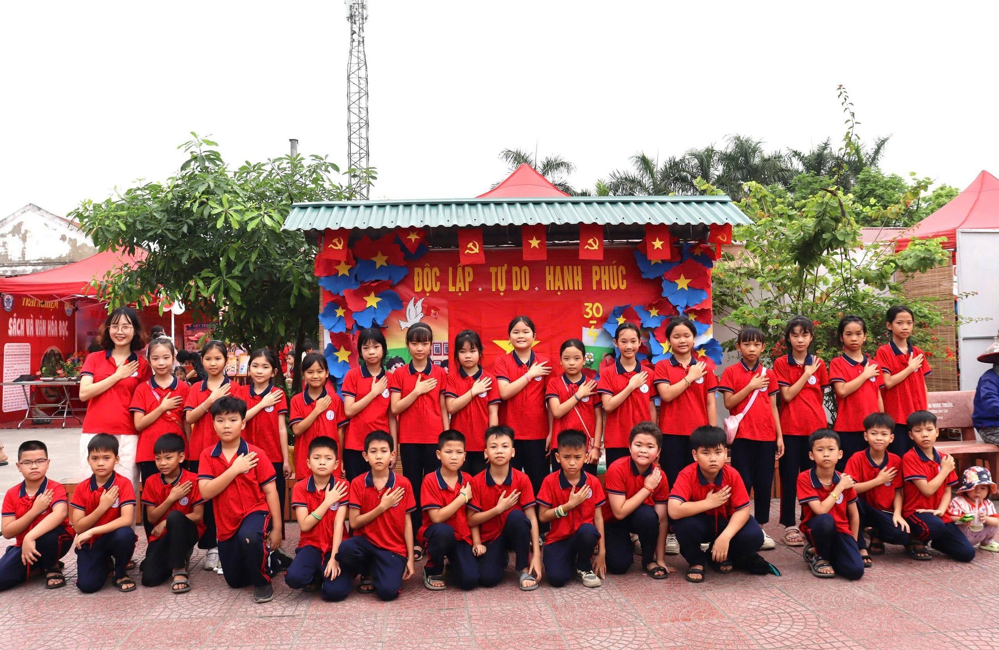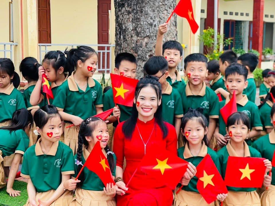 Cô và trò Trường Tiểu học Tử Lạc thích thú check-in, để lưu lại những kỷ niệm đẹp về ngày giải phóng miền Nam, thống nhất đất nước.
