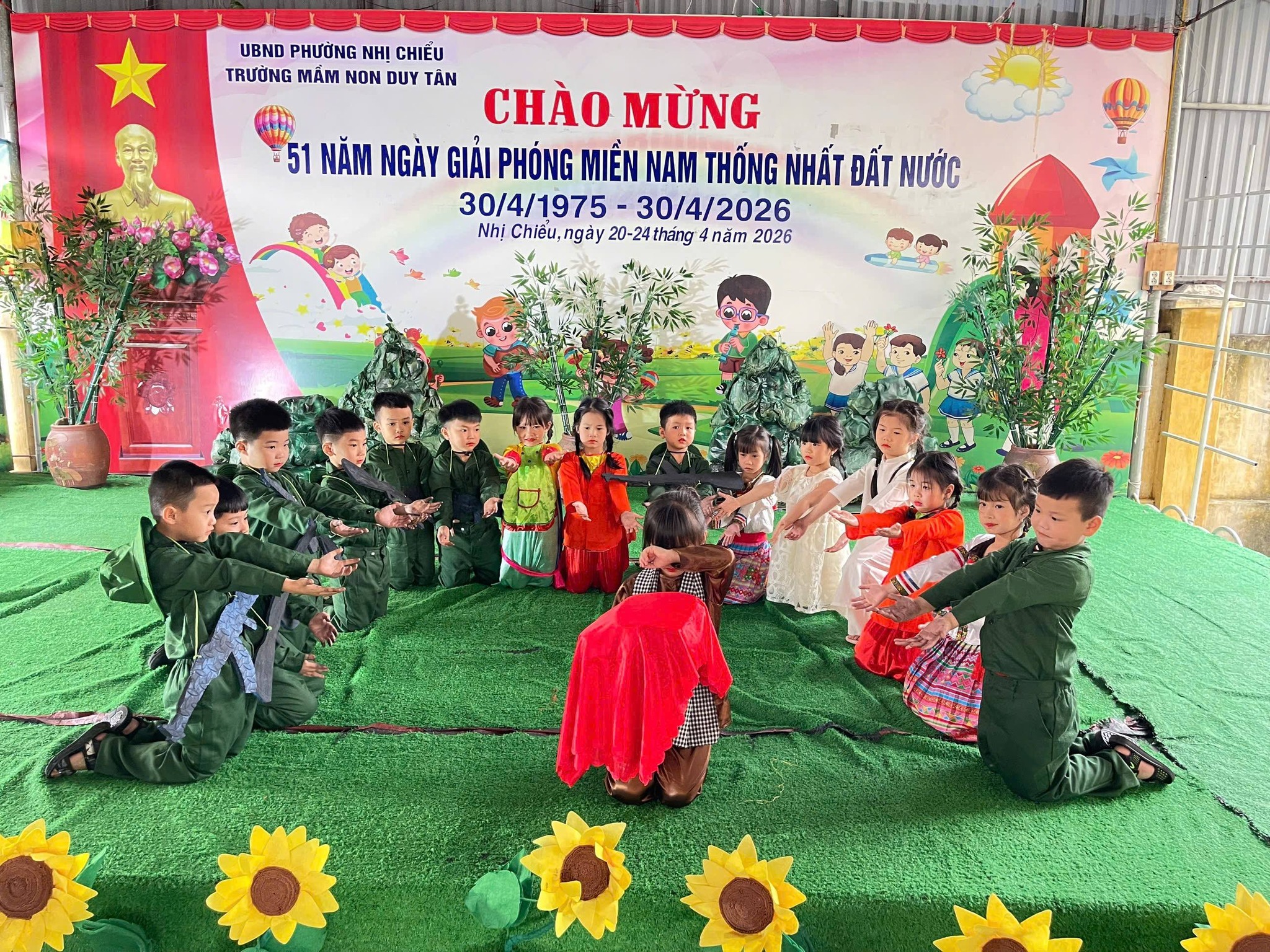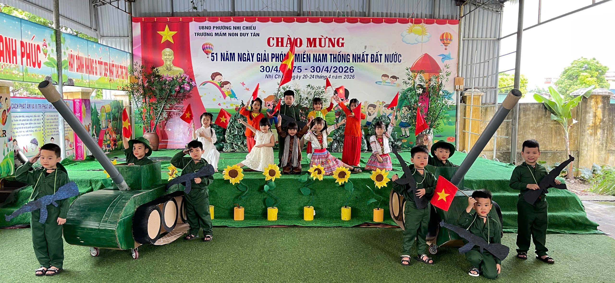 Hòa chung không khí tưng bừng của cả nước và thành phố, cô và trò Trường mầm non Minh Tân thể hiện tiết mục văn nghệ chào mừng ngày giải phóng miền Nam, thống nhất đất nước
