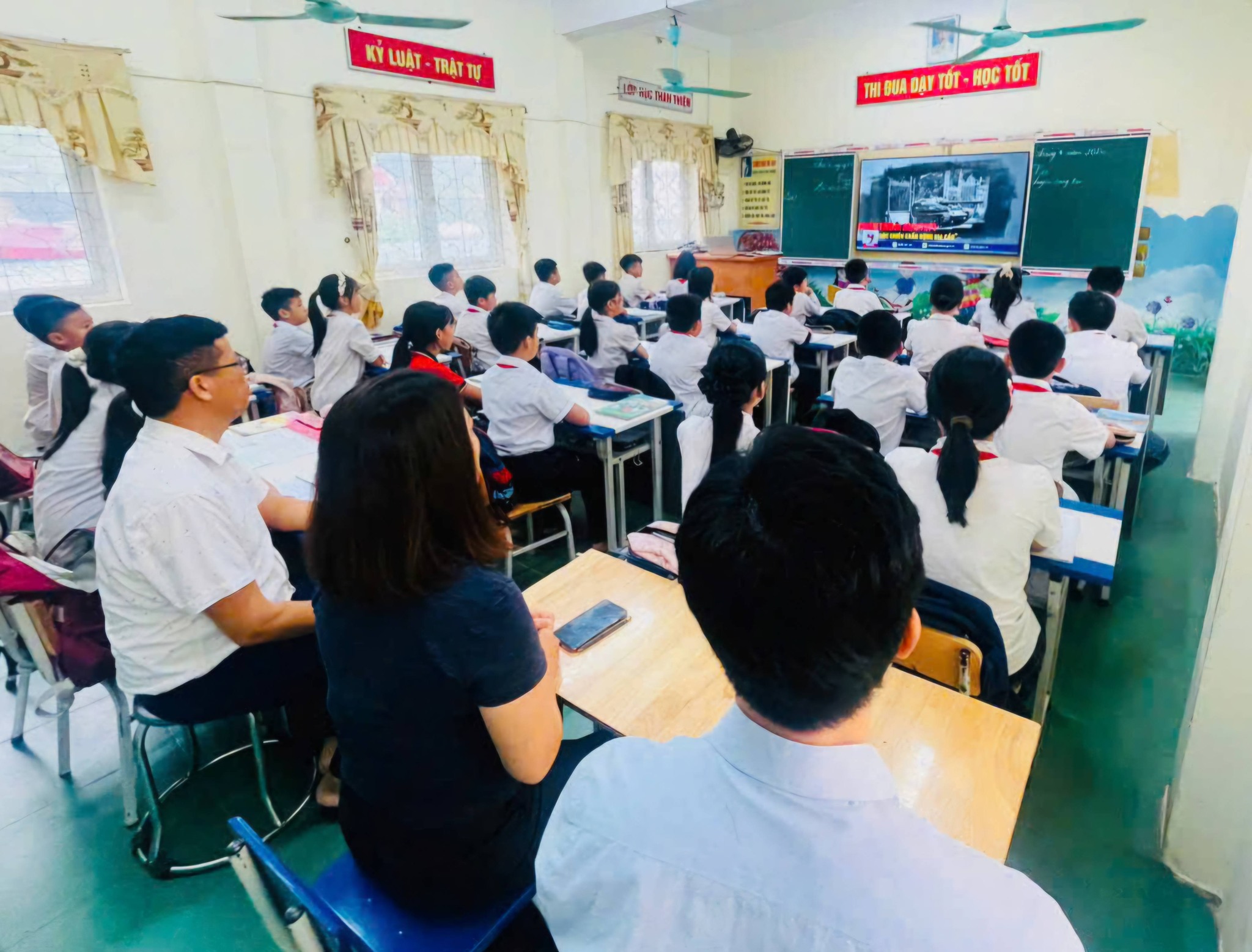 Thầy, cô giáo và các em học sinh Trường Tiểu học Hoành Sơn cùng xem tư liệu lịch sử Ngày giải phóng miền Nam