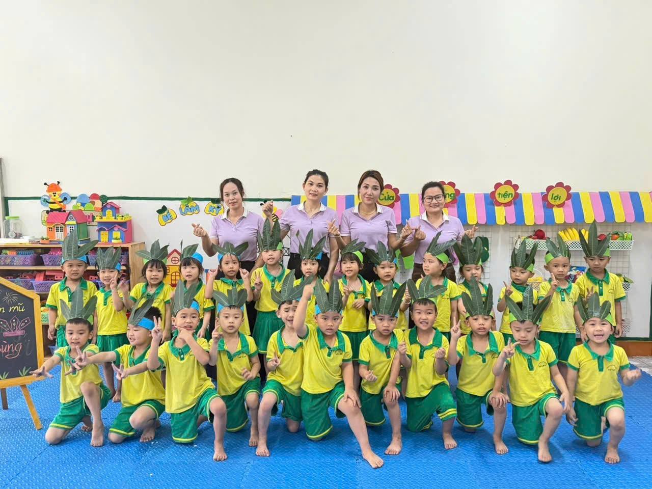 Cô và trò Trường Mầm non Tử Lạc lưu lại kỷ niệm tham gia trải nghiệm làm mũ Vua Hùng từ nguyên liệu thiên nhiên